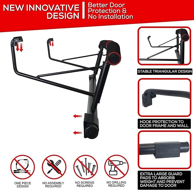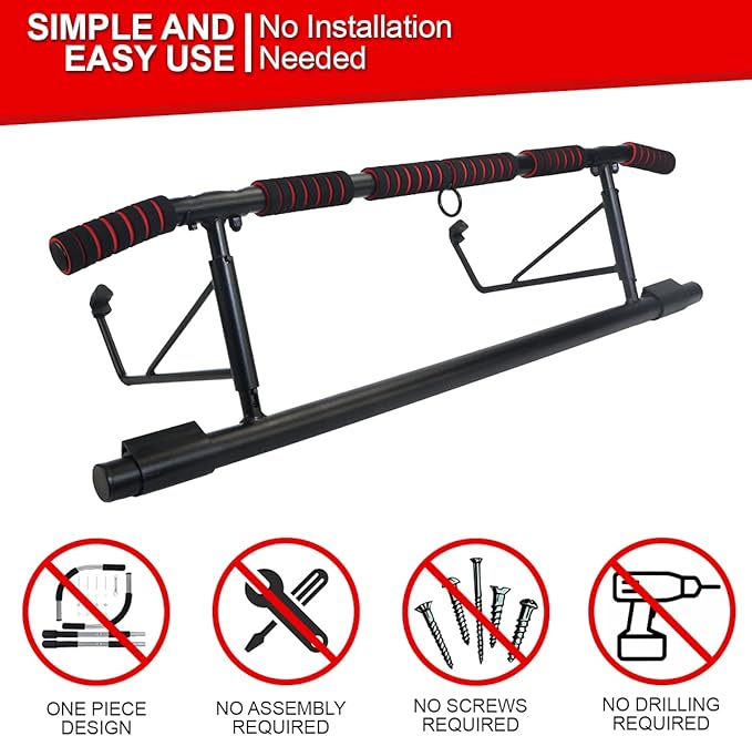 - 💪 EASY TO ASSEMBLE AND STORE: No installation needed: No screws, no assembly, no drilling. Solid steel construction for maximum stability, and ready for immediate use so you can get straight to work on the new you! Easy to set up and take down. Easy storage exercise equipment. Attaches and removes from the door frame in seconds. No damage caused to your door. The bar’s simple, folding design makes it a great space-saver for storing at home, especially smaller spaces like apartments and condos.