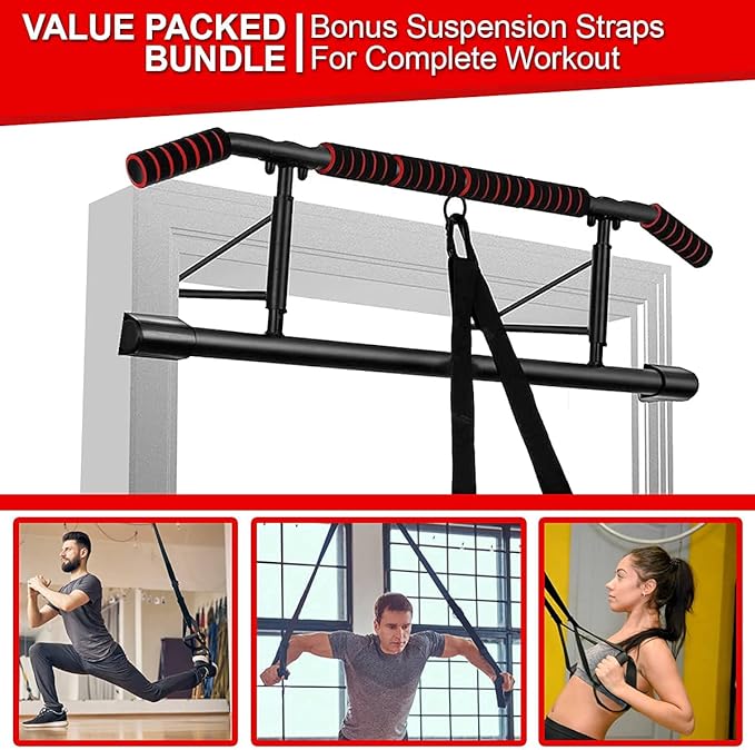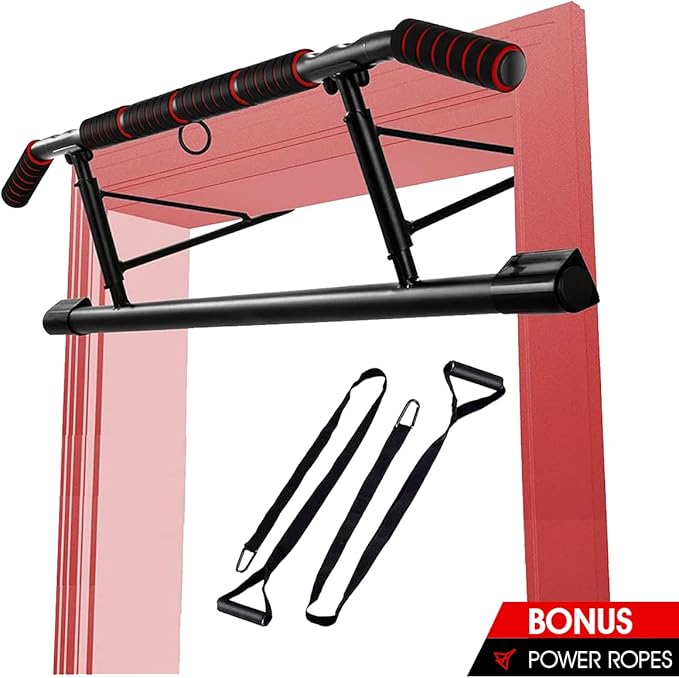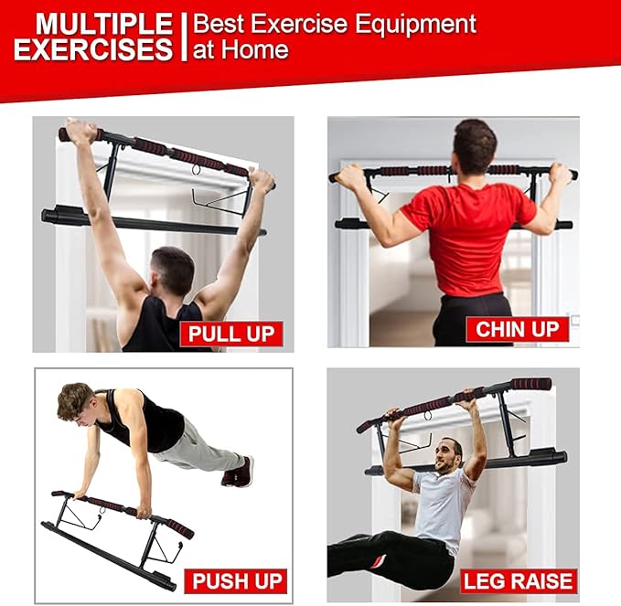 - 💪 LATEST ERGONOMIC DESIGN: This pull up bar adopts new ergonomic grips which are ideal for exercising and also can protect users from hand wrist or fatigue after training. Strengthen your latissimus dorsi, chest, arms, shoulders, back, abs and more. It also serves as a chin up bar doorway.