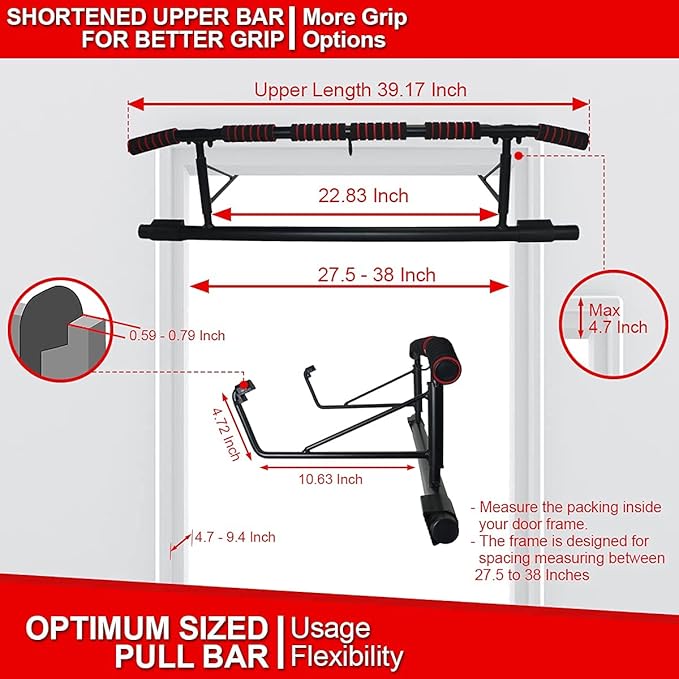 - 💪 MORE DETAILS: LuxeAMZ Pull Up Bar Doorway Station with ergonomic grip - The Pull Up Bar Ultra Elite. It can fit a door width of 23.33”- 36.22” (59 - 92 cm) and depth of 8.27” (21 cm), acceptable trim height up to 3.54"(9 cm). Enhanced and widened grip, no pain after frequent training. This multifunctional pull up bar has ergonomic angled grips and shortened upper bar and provides any home gym with the perfect pull up and calisthenics station.