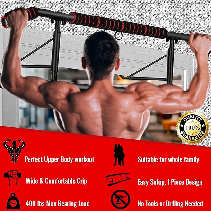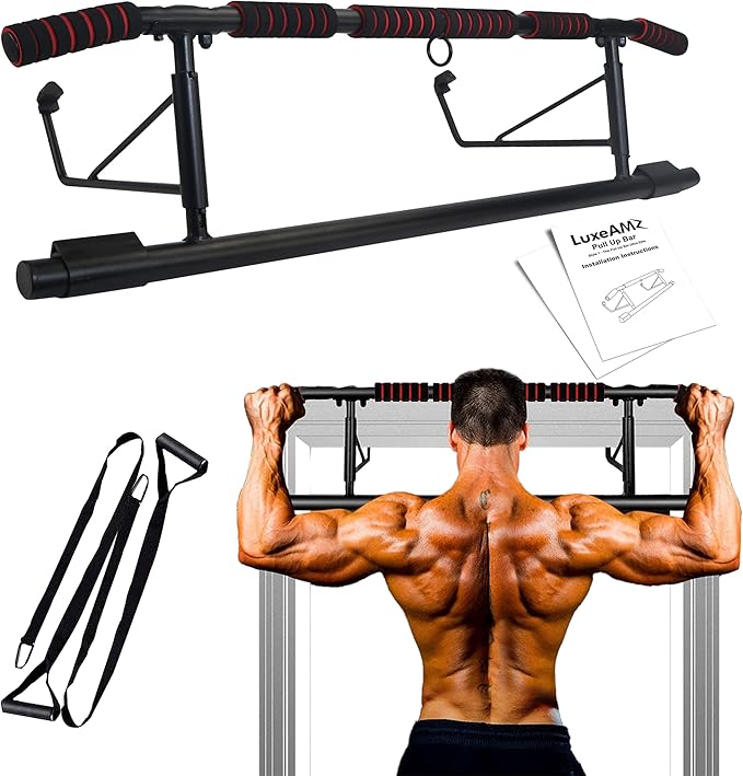 - 💪 LATEST UNIQUE DESIGN AND MULTI-PURPOSE: 2024 Home Gym Series - Door Pull Up Bar Doorway trusted by millions worldwide 20+ countries. LuxeAMZ Pull Up Bar adopts new enhanced ergonomic angled grips for wide-grip pull ups, and is ideal for exercising and increasing the width of the lats, and also can protect users from hand wrist pain or fatigue. Our pull up bar for the doorway station can fit all doors. It holds up to 400 lbs (200kg). Ideal for pull-ups, chin-ups, push-ups, dips, leg raises.
