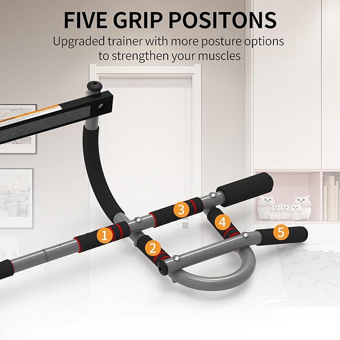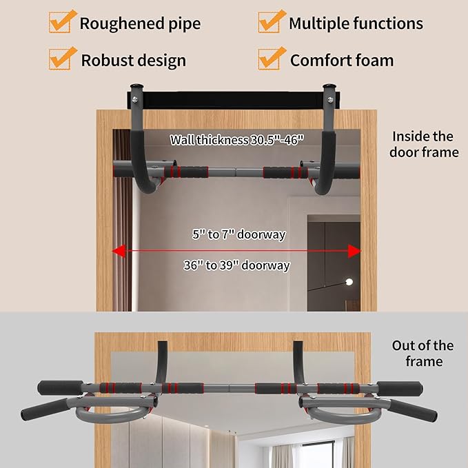 - 💪 HEAVY DUTY & SAFE: Made of high-quality alloy steel and with a fine powder coating, this pull up bar ensures extra safety and can hold up to 300lb. The handles are coated with high fiber foam for a comfortable grip, anti-slip, and wear resistance.