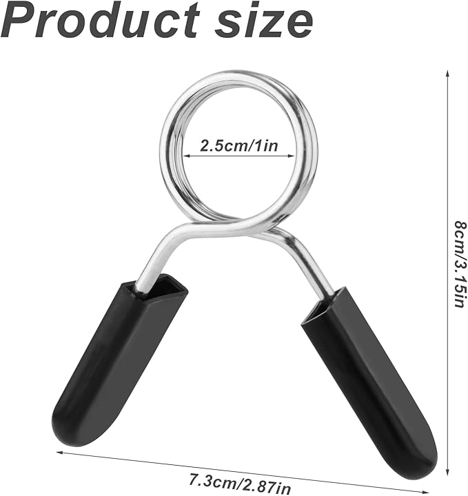 - Size Information: The size barbell clip is about 8x7.3x1.8cm/3.15x2.87x0.71 inch. Its inner diameter is 2.47cm/0.97in and fits 1-inch/2.54cm poles.