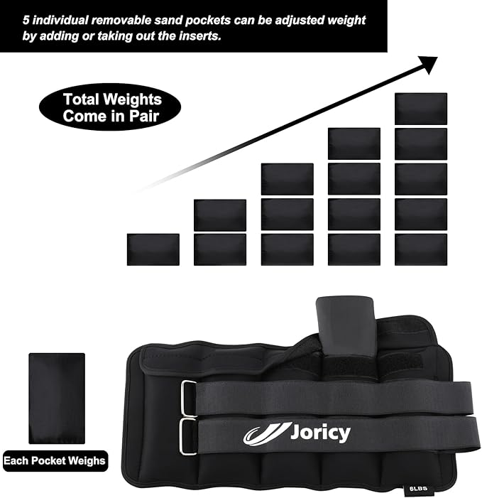- Adjustable Ankle Wrist Arm Leg Weights: 5 individual removable sand pockets for each hand weights for walking, each pocket weighs 1.2 lbs, total weights of a pair (each ankle weights for women 6lbs each) can be adjusted from 1-12 lbs by adding or taking out the inserts.