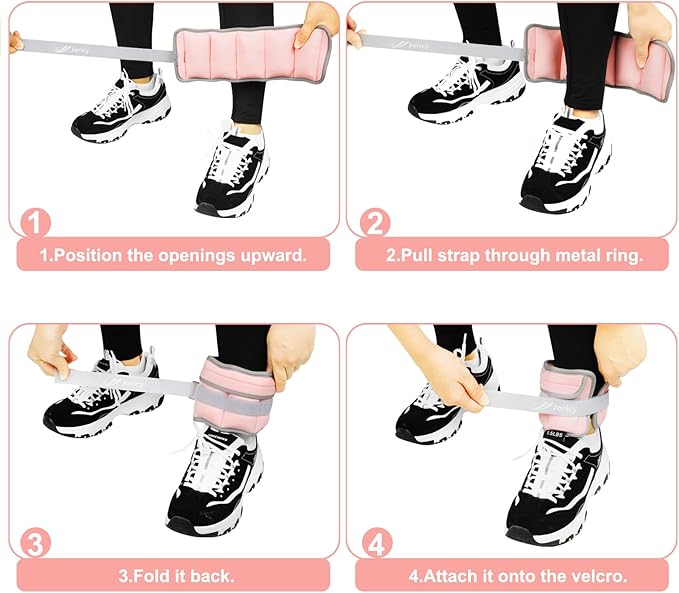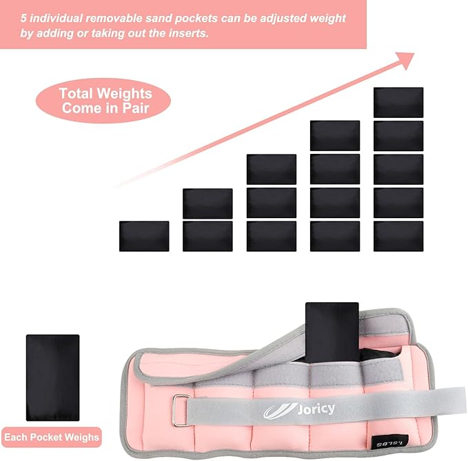 - Adjust ankle weights: 5 individual removable sand pockets for each ankle weight, each pocket weighs 0.5 lbs, total weights of a pair (each ankle weights 2.5 lbs) can be adjusted from 1-5 lbs by adding or taking out the inserts.