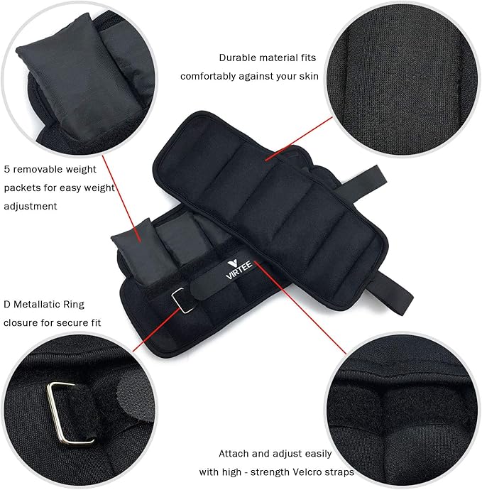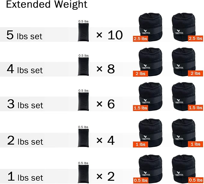 - FULLY ADJUSTABLE WEIGHTS: 5 removable sandbags for each ankle weights, each sandbag weighs 0.5 lbs, can easily be added or removed from 1 lb to 5 lbs pair.