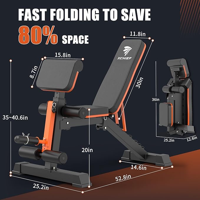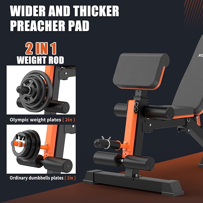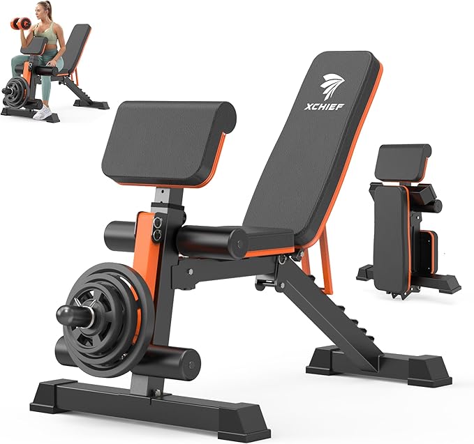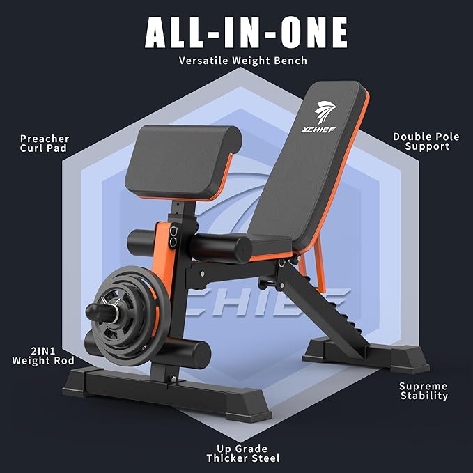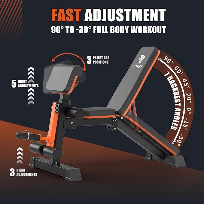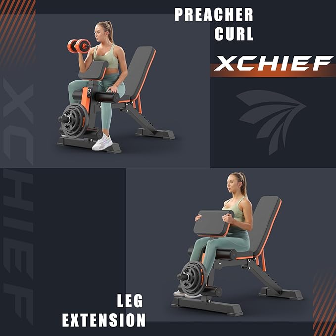 - 【FULLY ADJUSTABLE WEIGHT BENCH】The XCHIEF adjustable bench features 7 fast-adjustable backrest positions (including incline, decline, flat), 5 preacher pad positions, 3 pastor pad angles, and 3 foot positions. This versatile workout bench allows you to target specific muscle groups and customize your workout according to your fitness level.