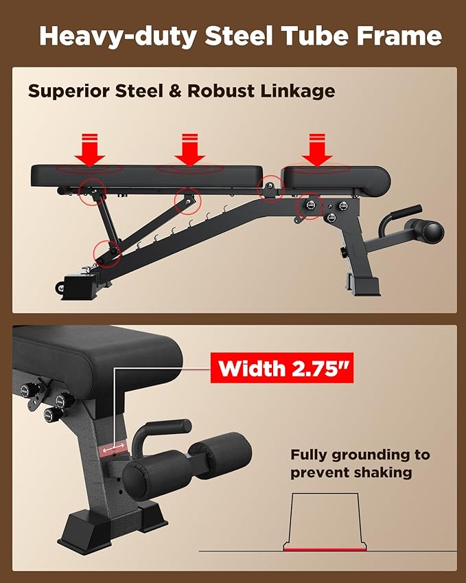 - 1200 LB MAX WEIGHT CAPACITY: Constructed with superior heavy-duty commercial-grade steel from our 2024 upgrade,and featuring a unique triangular support structure with a widened base, this bench ensures the utmost safety of users.One-piece construction almost replaces the folding function for greater load capacity(1200LB) and stability.