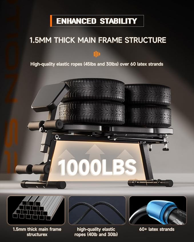 - 【Utility and Durability in Detail】The Motion Space Multifunctional Adjustable Fitness Bench features a one-click adjustment design, eliminating the need for rotation and making it more convenient to use. It is equipped with two sets of high-quality elastic ropes (40lbs and 30lbs) and over 60 latex strands, offering excellent elasticity and high resistance to tearing for enhanced safety.