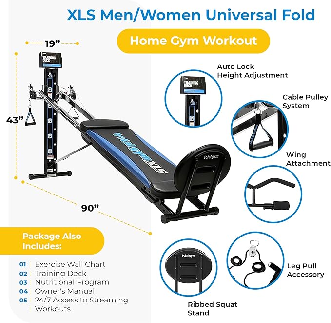 Total Gym XLS Men/Women Universal Total Body Training Home Gym Workout Machine with Squat Stand, Leg Pull, 2 Ankle Cuffs, and Exercise Chart