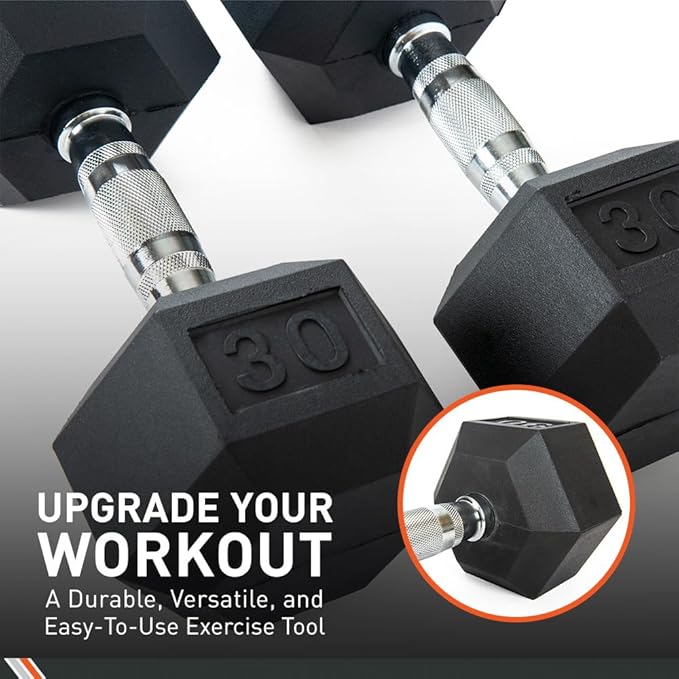 - DURABLE AND STYLISH - Solid rubber hex heads won’t roll or mark up your floors and look great; stainless steel shaft is covered in chrome for a polished, stylish look.