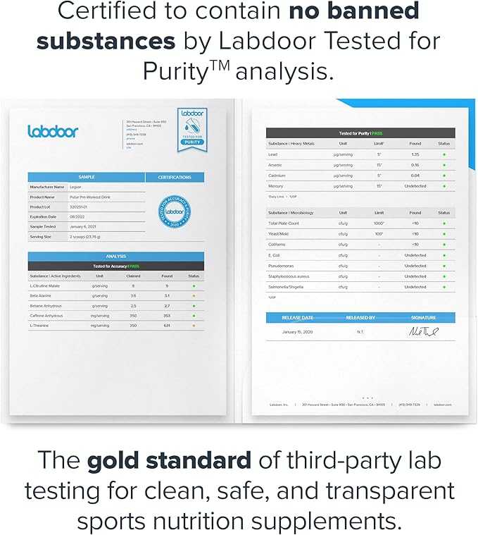 - Tested for purity and potency in an ISO 17025 accredited third-party lab, and independently certified to contain no contaminants or banned substances by Labdoor. Every bottle of our Pulse pre work out is guaranteed to provide exactly what the label claims and nothing else.