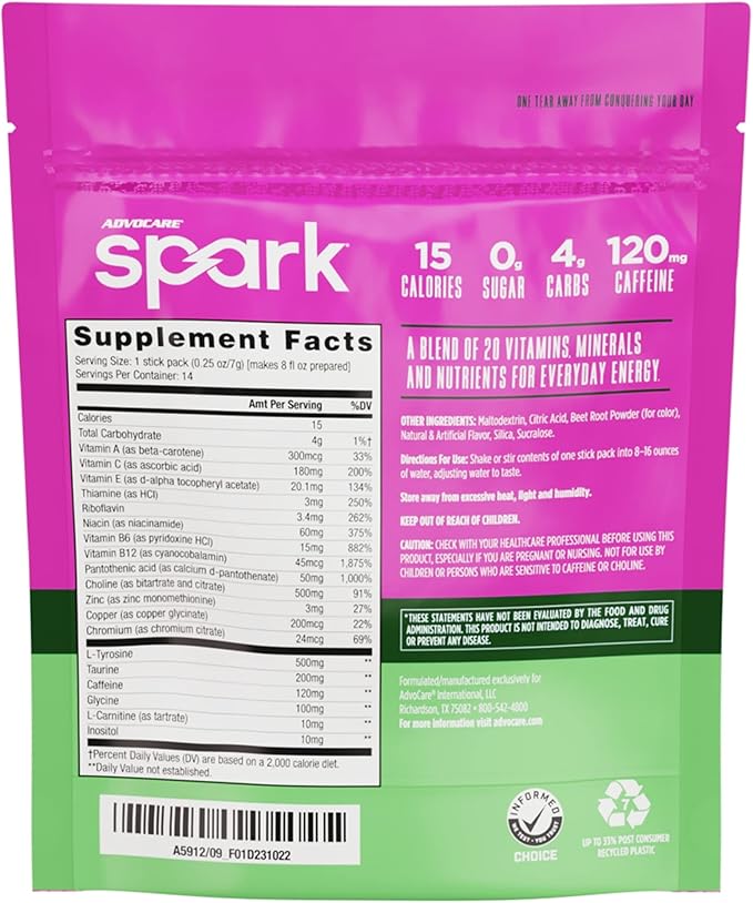 AdvoCare Spark Vitamin & Amino Acid Supplement - Focus & Energy Drink Powder Mix with Vitamin A, B-6, C & E - Also Includes L-Carnitine & L-Tyrosine - Water Melon, 14 Stick Packs