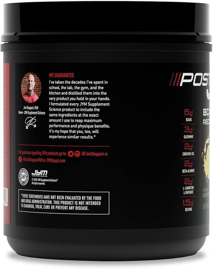 - QUALITY INGREDIENTS - The BCAAs (Branched chain amino acids), beta-alanine, creatine HCl and betaine found in Post JYM provide the optimum after-workout mix for increasing protein synthesis to maximize and extend muscle building.