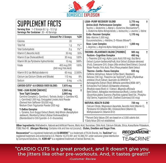 - Quicker Recovery: After an aggressive workout, Cardio Cuts has you covered. Packed with Glutamine, BCAAs, and a thorough Rejuvenation Complex, Cardio Cuts supports quicker recovery and repair. Cardio Cuts tastes great and mixes well.