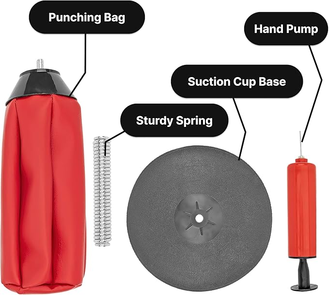 - Includes punching bag, spring, suction cup base, hand pump, and needle