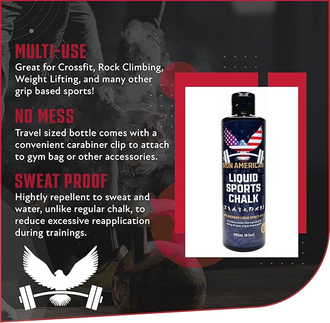 - (GET STRONGER): Need that extra push? IRON AMERICAN’s liquid chalk works just like white powdered hand chalk but with no chalky mess. Some customers claim up to a 20% increase in their deadlifts, grip, and performance after using IRON AMERICAN liquid chalk the first time