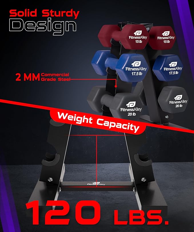 - Having capacity of 120 LB neoprene dumbbells storage, racks provides rubber clips on each holder over which any weight from 2lb to 20lb can be stored with ease