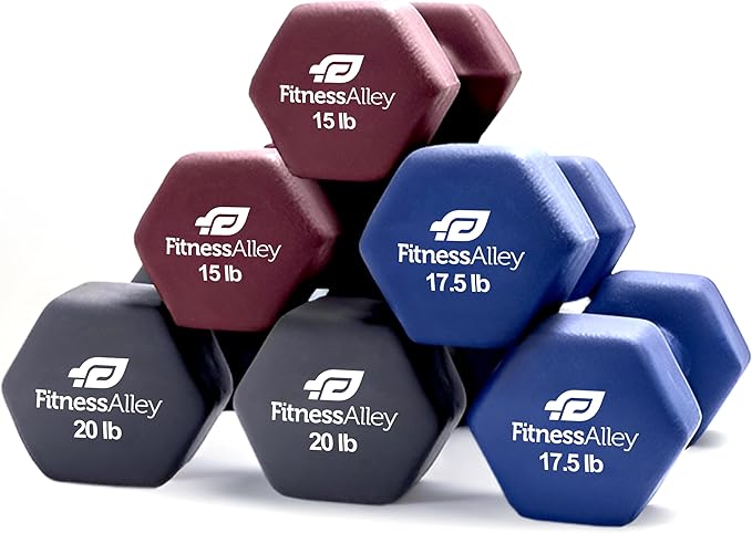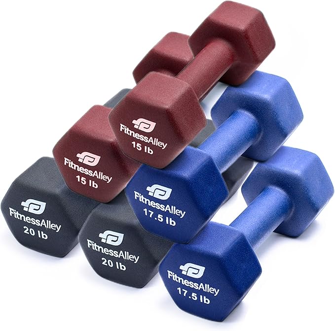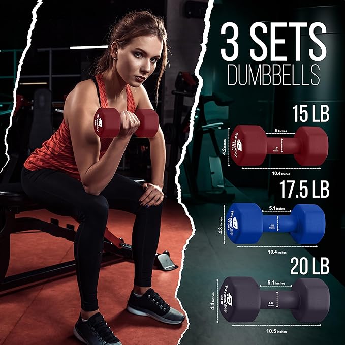 - The box includes 3 dumbbells pairs (15lb,17.5lb and 20lbs) with various colors. is of superior quality along with neoprene gripping that allows lifting of heavyweights simpler and easier