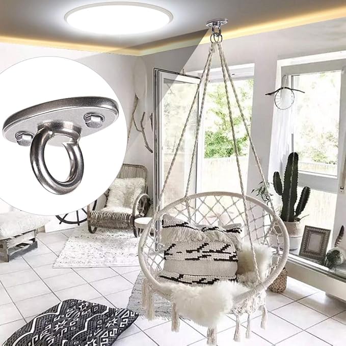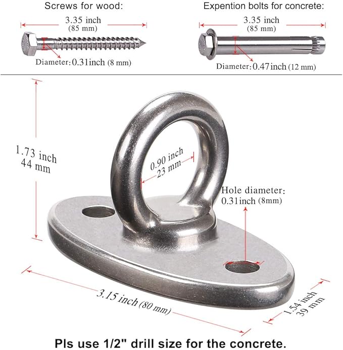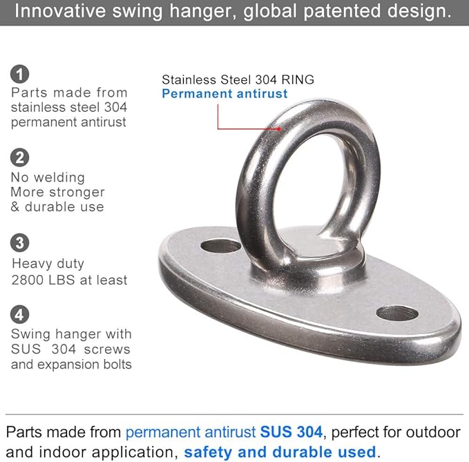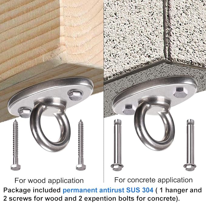 - EASY TO INSTALL: Include 2 expansion bolts and 2 wood screws. There are two holes in the base of the swing hanger, and use screws through this hole to fix it on the concrete ceiling or wooden beam. A unique one piece design and can be installed in minutes.