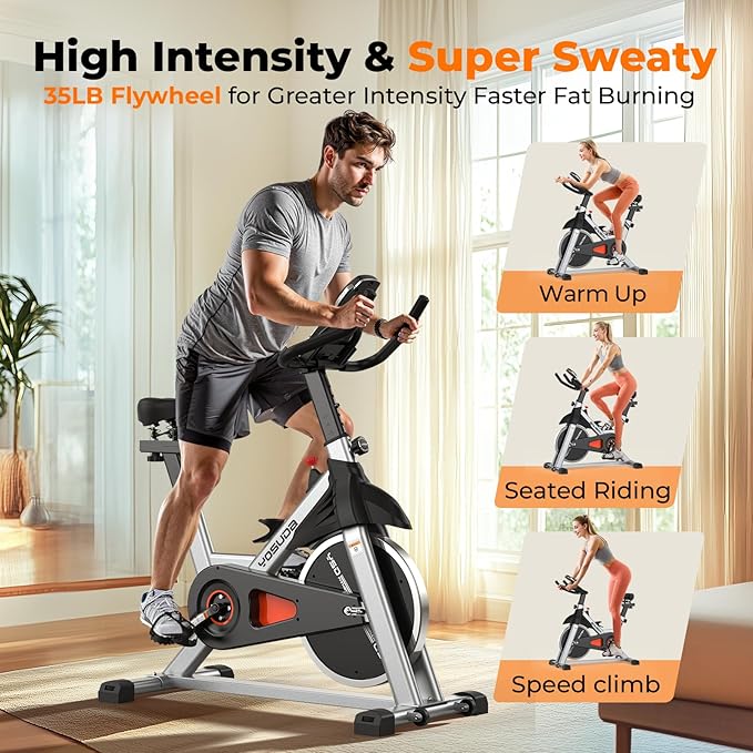 - Smooth Stationery Bike: 35lbs flywheel and heavy-duty steel frame of the exercise bike guarantee the stability while cycling. The belt driven system provides a smoother and quieter ride. It won't disturb your apartment neighbors or sleeping kids