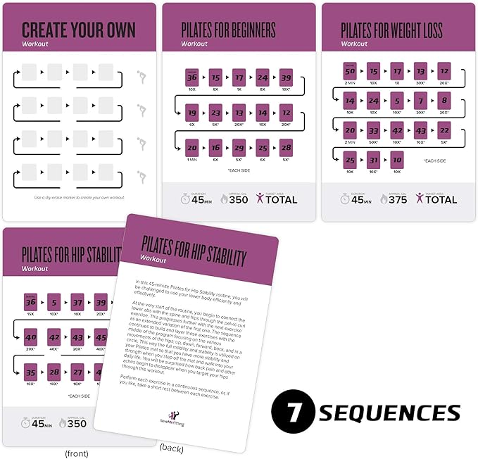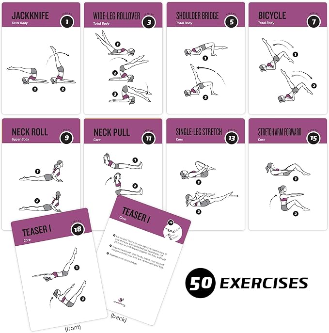 62 Pilates Exercise Cards, for Men/Women: Home, Gym or Studio: 50 Exercises, 12 Stretches 6 Training Exercises for Beginner to Advanced Waterproof