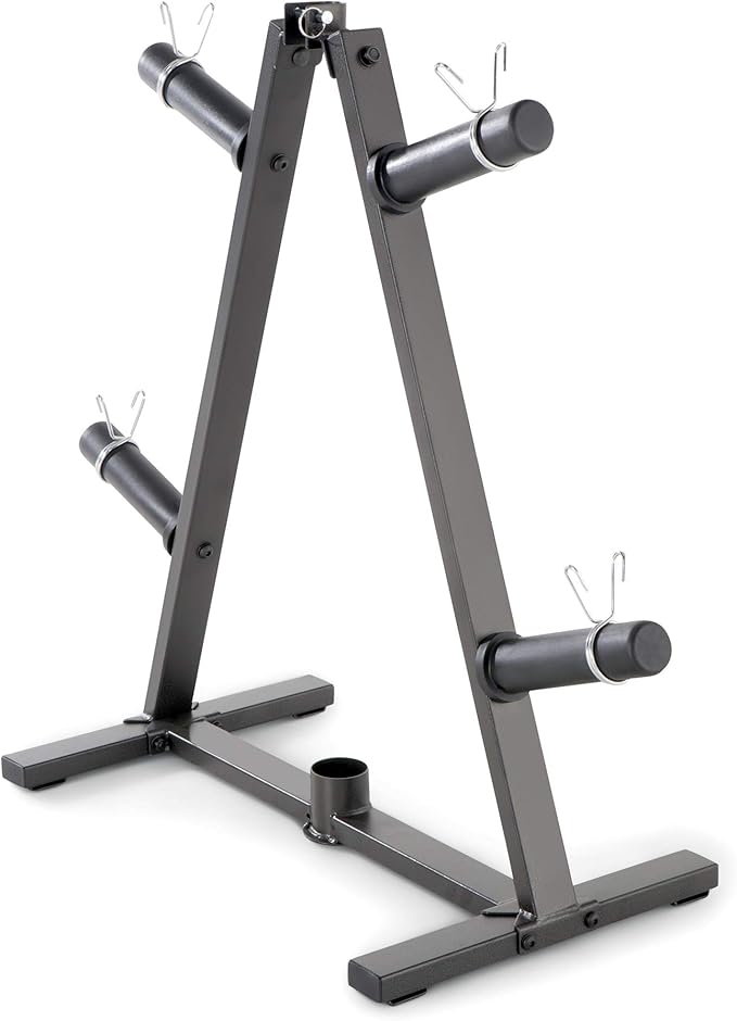 - COMPACT AND SPACE-SAVING DESIGN: This plate tree offers designated storage for your weight plates without taking up too much space in any room. Designed with ample storage space, it can accommodate several Olympic plates on its 4 pegs.