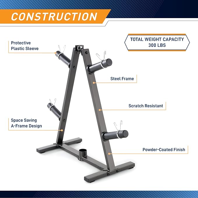- HEAVY-DUTY GYM ORGANIZER: Keep your lifting area organized with this A-frame weight stand designed for Olympic-sized weight plates with 2-inch diameter holes and an Olympic weight bar. Its sturdy frame can withstand a weight of up to 300 pounds.