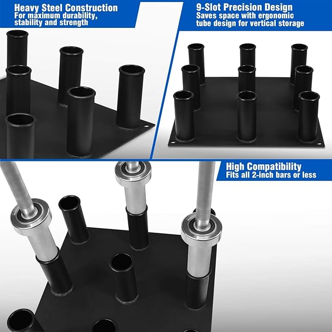 - 9-SLOT PRECISION DESIGN: Pro-quality barbell holder stores up to 9 2-inch Olympic bars with minimalistic design and plasma cut components for security during usage