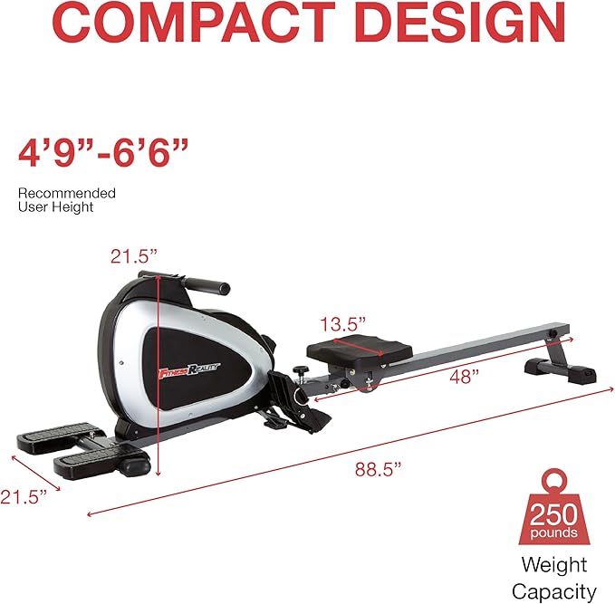- FULL BODY FITNESS: Engage your arms, legs, and core, and increase cardiovascular health. Our row machine has a wide cushioned seat and handlebar, anti-slip pedals, and sliding rail extension for a safe workout. Recommended user height: 4’9” - 6’6”.