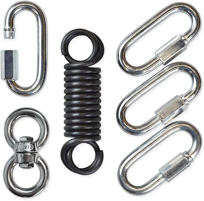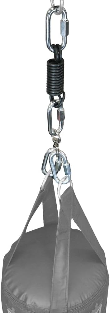- Includes 4 screwlock carabiners, heavy duty swivel and Meister Heavy Bag Spring (for bags up to 250lb)
