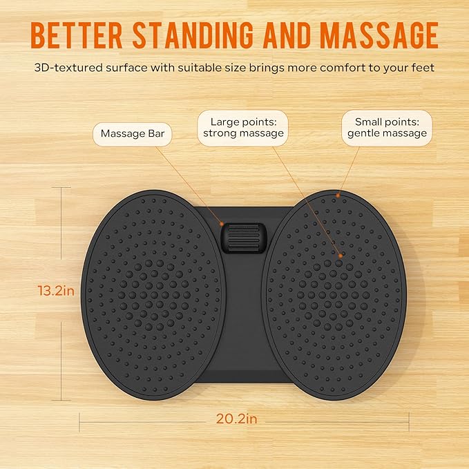 - 【3D FOOT MASSAGER】-Textured standing surface with 2 sizes massage points can reduce tension by massaging and stimulating acupuncture points on feet, the extra massage is a good massage tool to relax foot arch. The standing desk mat is also ideal to improve balance and core strengths.