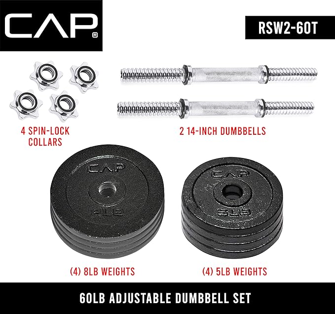 - Set includes – 60 lbs. Total: two 14” dumbbell handles, four 5-pound plates, four 8-pound plates, and four-star lock collars. Great for targeting Individual muscle groups or incorporating into a full body workout.