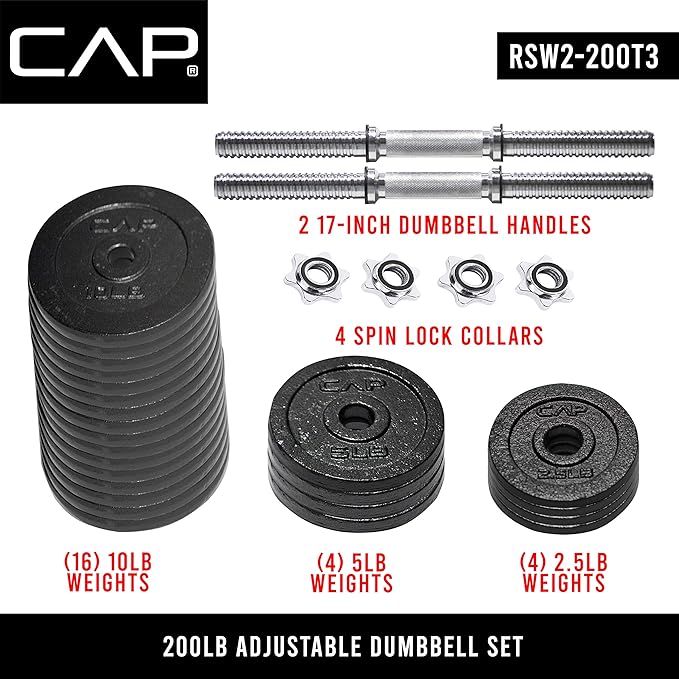 - SET INCLUDES – 200 POUND TOTAL: TWO 17” dumbbell handles, FOUR 2.5-pound plates, FOUR 5-pound plates, SIXTEEN 10-pound plates, and FOUR star-lock collars. Great for targeting individual muscle groups or incorporating into a full body workout.