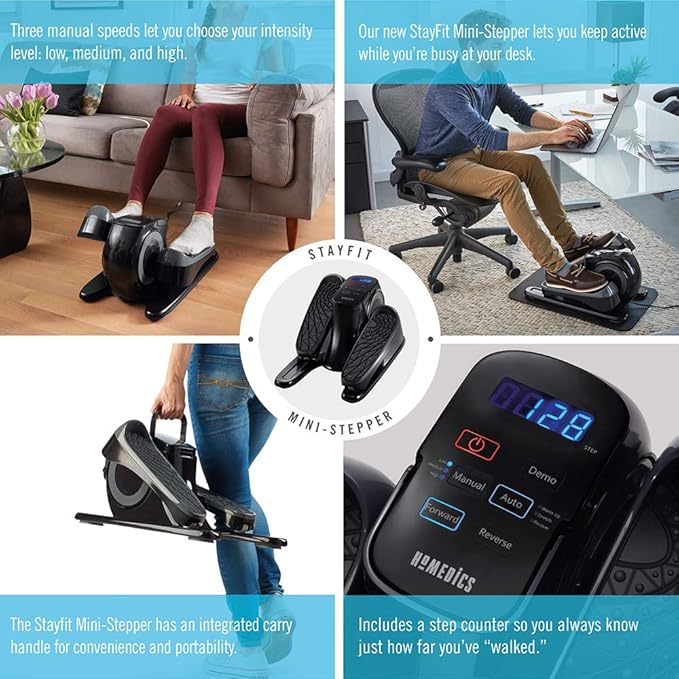- CONVENIENT EXERCISE: Get ready to burn calories anytime - even when you’re on the clock. HoMedics StayFit Mini-Stepper allows you to keep active while you’re busy at your desk or at home watching tv. The included mat protects your floors and keeps it in place