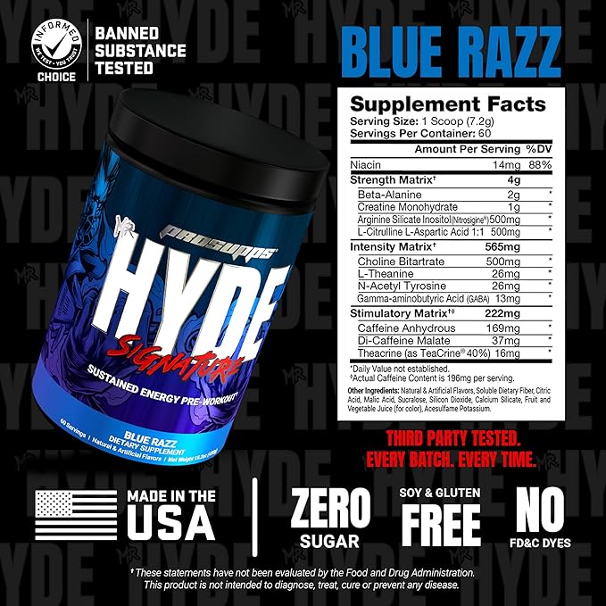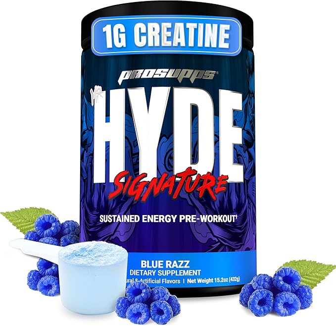 - Crush Every Workout with HYDE: ProSupps Mr. HYDE Signature is a pre-workout powder designed to enhance energy, focus and promote increased blood circulation for peak muscle performance. Developed with trusted ingredients to help anyone from all fitness levels. Blue Razz Flavor. 60 servings. 196 mg caffeine/serving.
