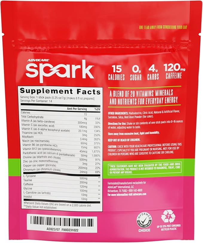AdvoCare Spark Vitamin & Amino Acid Supplement - Focus & Energy Drink Powder Mix with Vitamin A, B-6, C & E - Also Includes L-Carnitine & L-Tyrosine - Strawberry, 14 Stick Packs