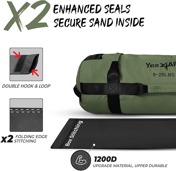 - 💪 HEAVY DUTY CAPACITY: Durable nylon workout sandbags with waterproof PU coating offers durability for regular workouts; Its strategic design with strong inner bags and X-shaped stitches on handles helps training seamlessly and effectively