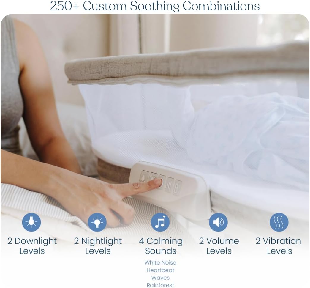 - SOOTHING FUNCTIONS: Multiple Levels of built-in vibrations and soothing calm sounds, and a nightlight with an auto shut-off feature to help your baby fall asleep (and stay asleep).