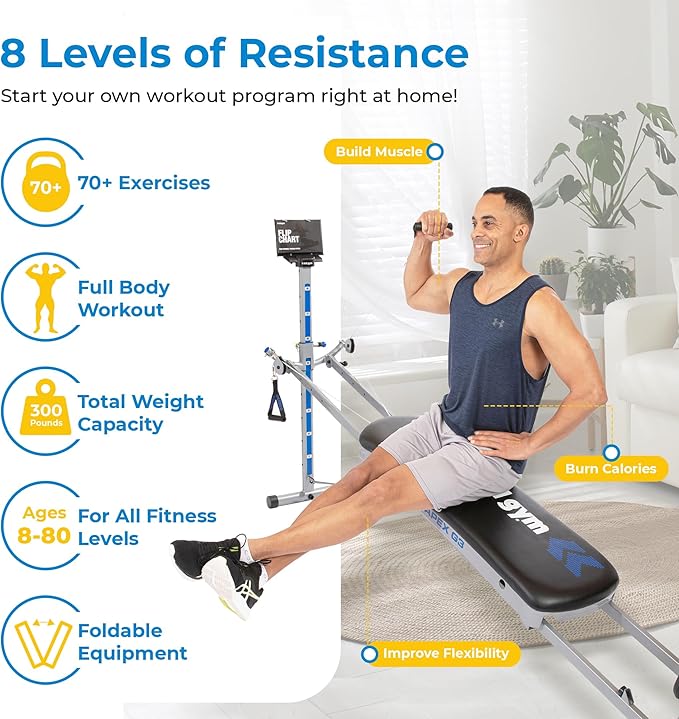 - VARIOUS WORKOUT OPTIONS: Start your at-home workout with 8 resistance levels and over 70 exercises using Total Gym; Enjoy low-impact, fluid movements, effortlessly transitioning between exercises