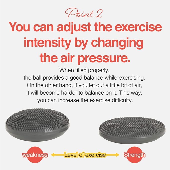 - 【Strength core and flexibility】 Balance disc is suitable for a variety of exercises including when on a diet, improving posture, stretching or torso training. you can adjust the intensity of the exercise from the air pressure. There are a variety of exercise. Standing with your weight on one leg and raising the other leg to the side or behind you. Putting your heel right in front of your toe, like walking a tightrope.