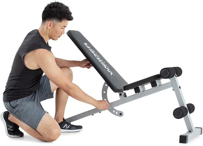- 7 Bench Positions; Adjust this versatile slant bench between four levels of incline, flat, and decline positions to perform a variety of strength-building exercises; Tethered safety pin included