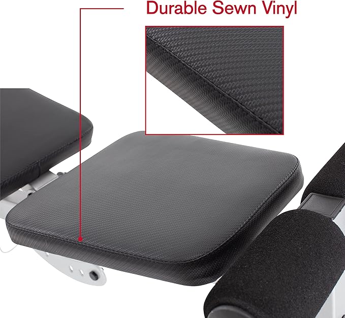 - Sewn Vinyl Seat; Tear-resistant vinyl is easy to wipe clean after an intense workout; Exercise Chart Included; Learn new routines and proper form with a professionally-designed exercise chart
