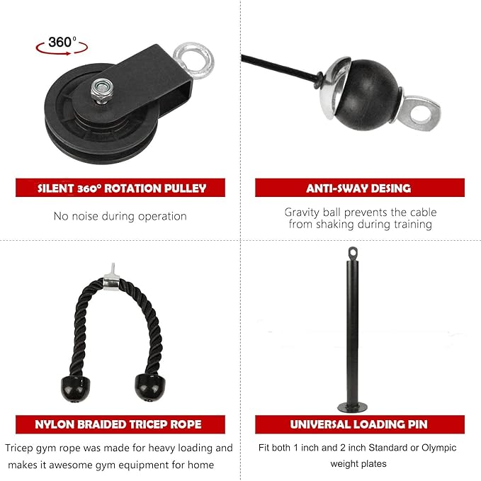 - Package included:1x l pulley, 1x 2M adjustable steel cable, 3x carabiners, 1x tricep rope,1xNylon Strap Circle and 1x loading pin, providing great versatility for your home gyms, training studios or various workout environments