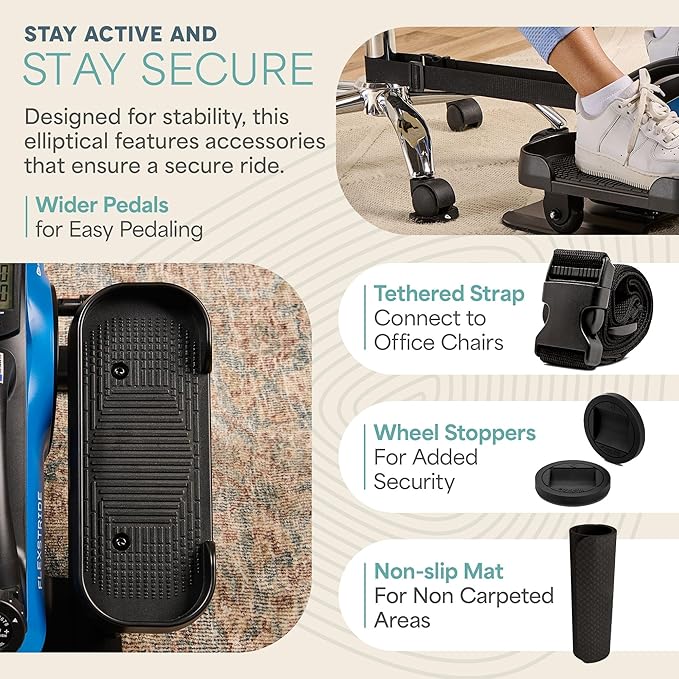 - No More Shaky Workout: Our portable FlexStride Plus comes with; Yoga mat and Resistance band to use with your ellipse leg exerciser for fitness goals, castor stoppers for shaky chairs and straps to tether stationary pedal exerciser to your chair