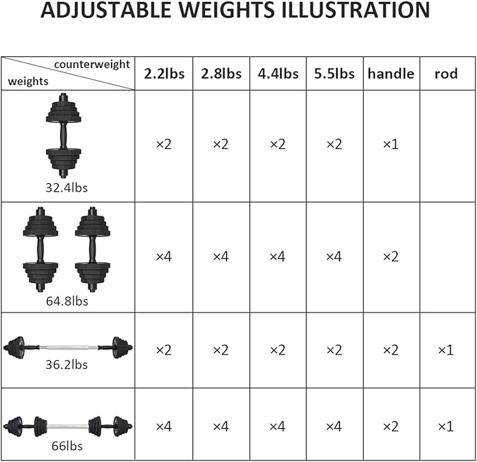 - 【Adjustable Weights】- Each side dumbbell 33lbs max, if you assemble it as a barbell, total weight up to 66lbs. You're free to customize the weight setting to meet the training needs. Made of stable steel mixed substance and TPU material, the fitness dumbbells kit provides you with various weight options, ranging from 7.2lbs to 66lbs.