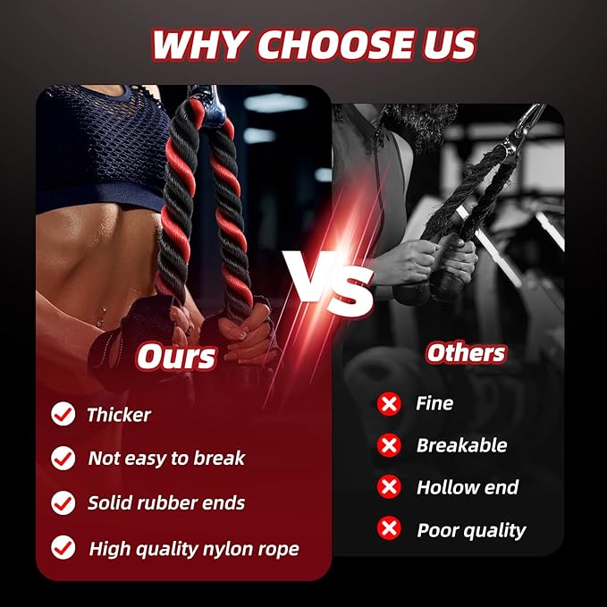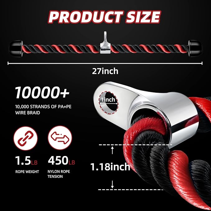 • Commercial Quality: The cable rope for tricep is 27-inch high quality nylon braided rope with rubber stoppers, strong and sturdy.