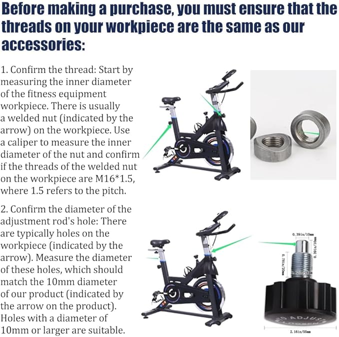 - Before making a purchase, you must ensure that the threads on your workpiece are the same as our accessories.Note 1:Confirm the thread: Start by measuring the inner diameter of the fitness equipment workpiece. There is usually a welded nut on the workpiece. Use a caliper to measure the inner diameter of the nut and confirm if the threads of the welded nut on the workpiece are M16*1.5, where 1.5 refers to the pitch