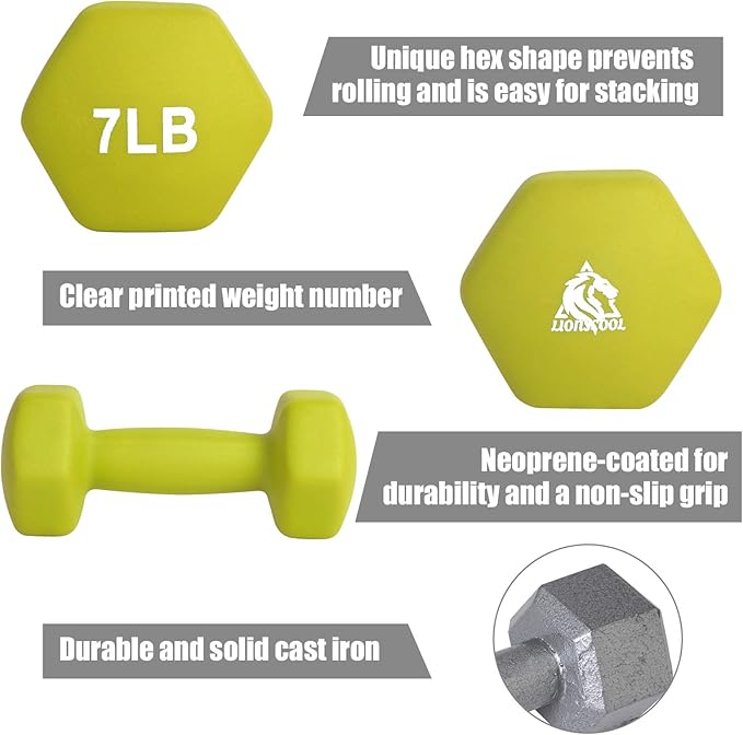 - Comfortable Grip and Anti-Roll Design: The neoprene coating on LIONSCOOL dumbbells offers a comfortable and secure grip and protects fitness equipment from getting damaged. The hexagonal shape of the dumbbell heads prevent the dumbbells from rolling away when setting them down to perform other exercises.