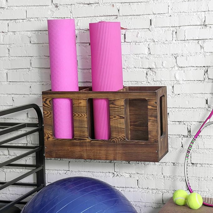 - Vintage dark brown wood gym sports equipment holder perfect for organizing foam rollers or yoga mats in your home gym or fitness center **Some assembly required**