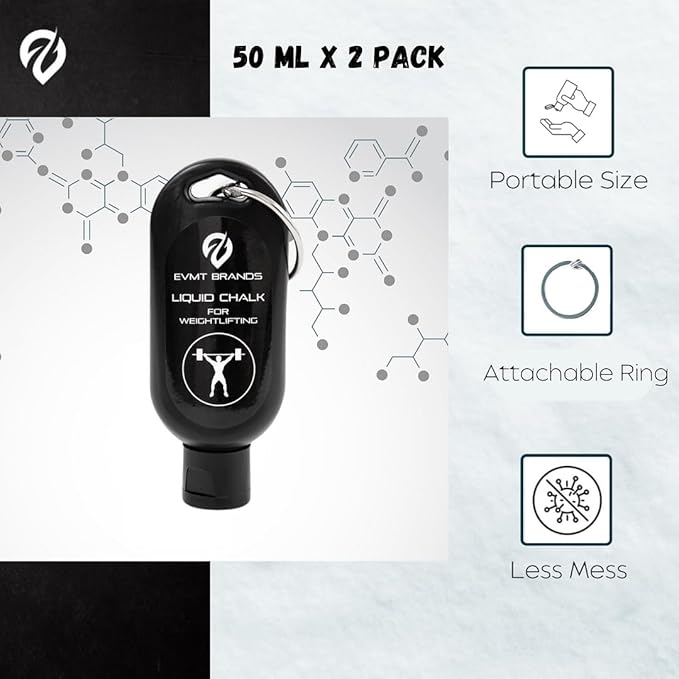 - High-Friction Weightlifting Liquid Hand Chalk – Sweat-resistant magnesium carbonate formula in a quick-drying, mess-free liquid designed to improve grip and control on barbells, kettlebells, and pull-up bars during strength training.